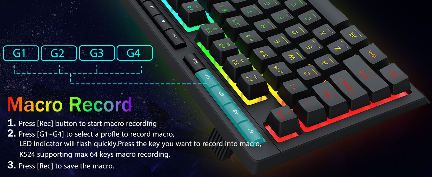 Proqram dəstəyi -Öz yeni rejimlərinizi və effektlərinizi hazırlamaq üçün mövcud proqramdan istifadə edərək seçimlərinizi genişləndirin. Daha səmərəli iş və oyun üçün müxtəlif açar sözləri və ya qısa yolları olan makroslar. Proqram Link: Bit.ly/k524wireDriver