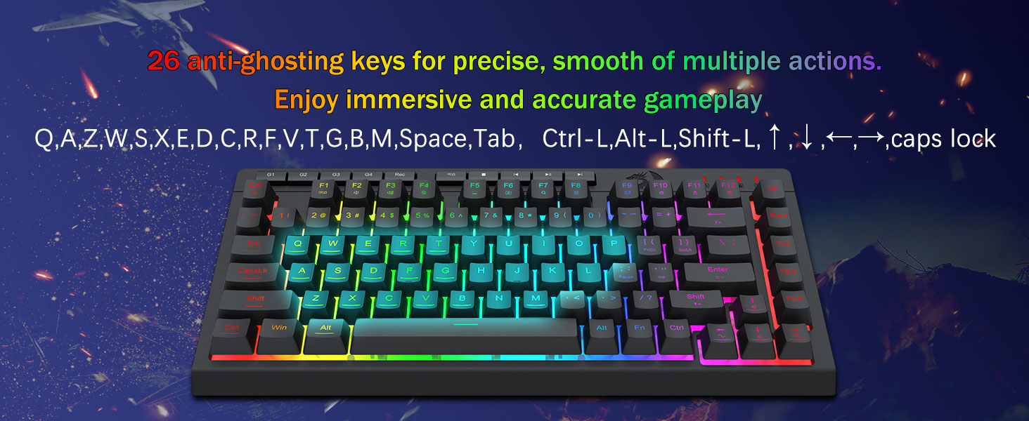 26 Anti-Ghost Açar və Xüsusi Media Nəzarətləri -Sürətli və dəqiq oyun üçün eyni vaxtda işləmək üçün eyni vaxtda işləməsi üçün 26 düymənin işləməsinə imkan verən anti-ghosting düymələri (açarları) featuring. Xüsusi media idarəsi, oyununuzun hamar və fasiləsiz olması üçün klaviaturadan multimedia-nı klaviaturadan oynamağa, fasilə verin və atlamağa imkan verir.
