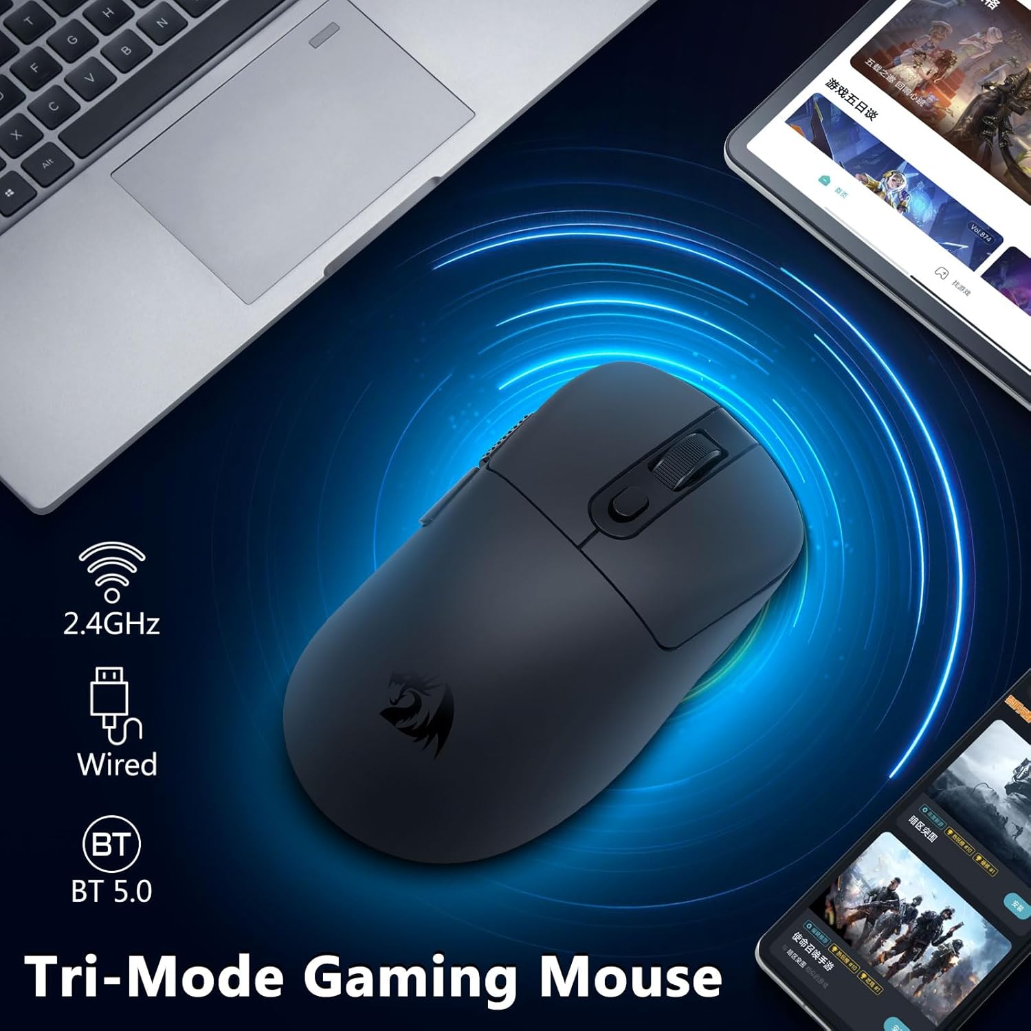 CHUANGQUAN Black M818 Wireless 24,000 DPI, Tri-Mode 2.4G Gaming Mouse dəqiq izləmə, çevik əlaqə və hamar idarəetmə təmin edir, sürət, dəqiqlik və qüsursuz multi-cihaz performansı axtaran oyunçular və peşəkarlar üçün idealdır.