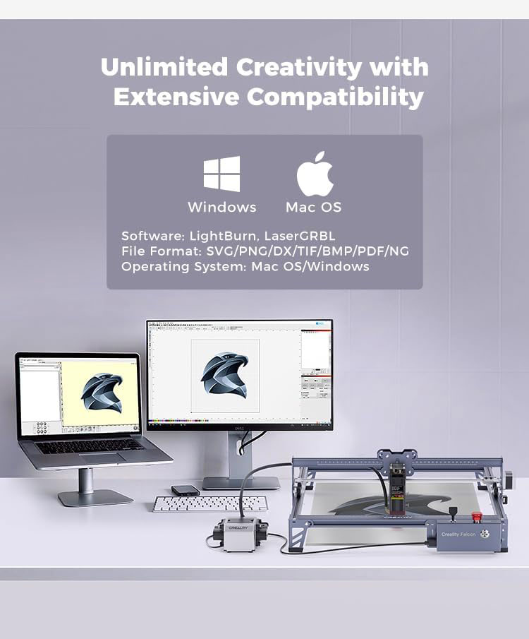 · 【Uyğunluq təfərrüatları ilə güclü və davamlı】Dəqiq və hamar hərəkət anodlaşdırılmış alüminium ərintiləri, L formalı silikon ayaq yastiqləri və 8 mm polad rels ilə təmin edilir. Quraşdırılmış hamarlayıcı sürüşmənin qarşısını alır və lazer oyma avadanlığının düzgün yerləşdirildiyini müəyyən etmək üçün kalibrlənir. Paketi əldə etdikdən sonra onu özünüz quraşdırmalısınız; tamamlamaq üçün təxminən 10 dəqiqə çəkir. Creality falcon lazer oyma maşını təcrübəli lazer istifadəçisi üçün LightBurn və yeni lazer istifadəçisi üçün LaserGRBL daxil olmaqla müxtəlif oyma proqramları ilə uyğun gəlir.